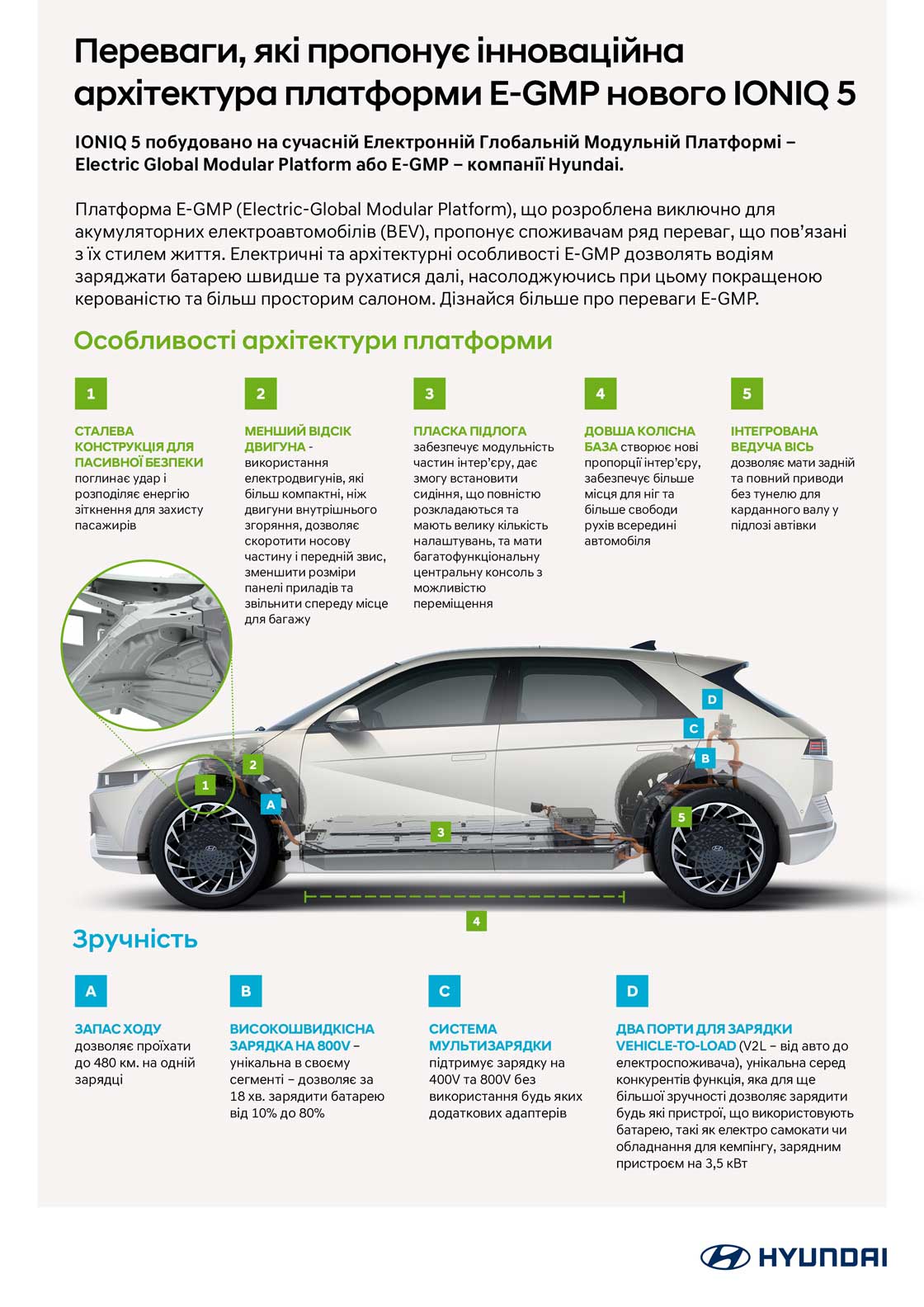 Розробка E-GMP (Electric-Global Modular Platform) – першої в історії платформи Hyundai Motor, присвяченої виключно акумуляторним електроавтомобілям  – свідчить про нову еру в історії компанії Hyundai. Виступаючи відправною точкою для нового покоління автомобілів Hyundai  з електричною силовою установкою, платформа забезпечує значні вдосконалення в  конструкції електроавтомобілів, що  ще більше відповідають різноманітним стилям життя клієнтів. Відданість Hyundai темі екологічної мобільності підштовхнула компанію до амбітної мети – розробити щонайменше 11 моделей виключно з електричною силовою установкою протягом наступних п’яти років.