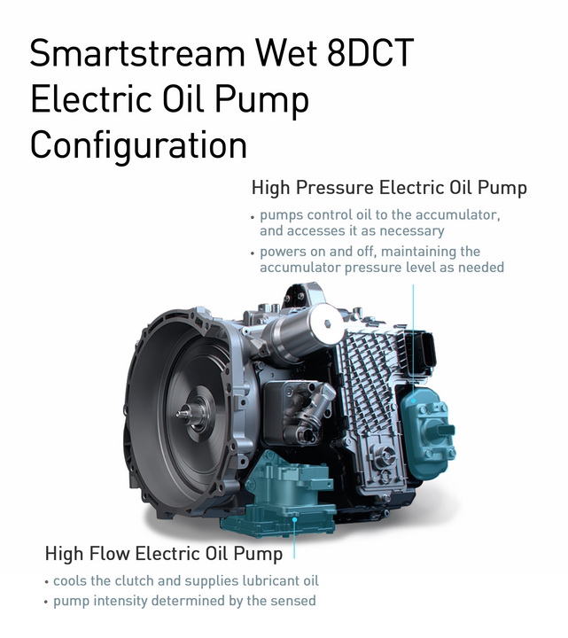 Система електричних насосів складається з високошвидкісного електричного масляного насоса, який відповідає за змащування шестерней і охолодження зчеплення, і електричного масляного насоса високого тиску, який подає масло в акумулятор і підтримує тиск, необхідний для управління перемиканням передач. Разом вони гарантують, що DCT мокрого типу буде працювати з мінімальними втратами потужності двигуна, а позитивним побічним ефектом від зменшення втрат буде додаткова економія палива. Ця нова, покращена насосна система збільшує кількість можливих застосувань для NDCT мокрого типу, що робить її оптимальною для використання в автомобілях з високим крутним моментом. Подвійна перевага: ця система надає можливість збільшення максимально допустимого крутного моменту, внаслідок чого керування автомобілем стає більш захопливим через підвищення ефективності передачі потужності і прискорення.