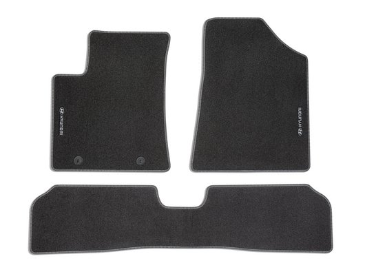 Високоякісні велюрові килимки забезпечують захист підлоги та стиль, завдяки якому інтер’єр виглядає чистим і новим. Вони виготовлені спеціально для ідеального розміщення в просторі для ніг і утримуються на місці стандартними точками кріплення та протиковзкою підкладкою. Килимки переднього ряду мають вишитий логотип Hyundai. Набір із 4 шт.